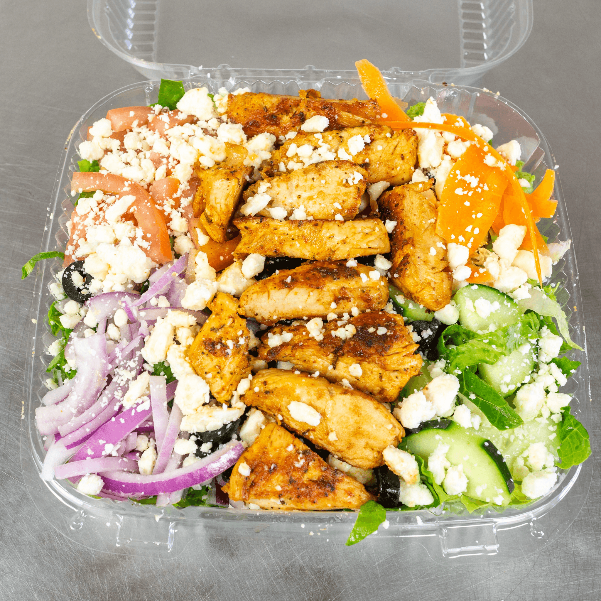Lettuce, onions, cucumber, black olives, tomato & carrots topped with feta cheese