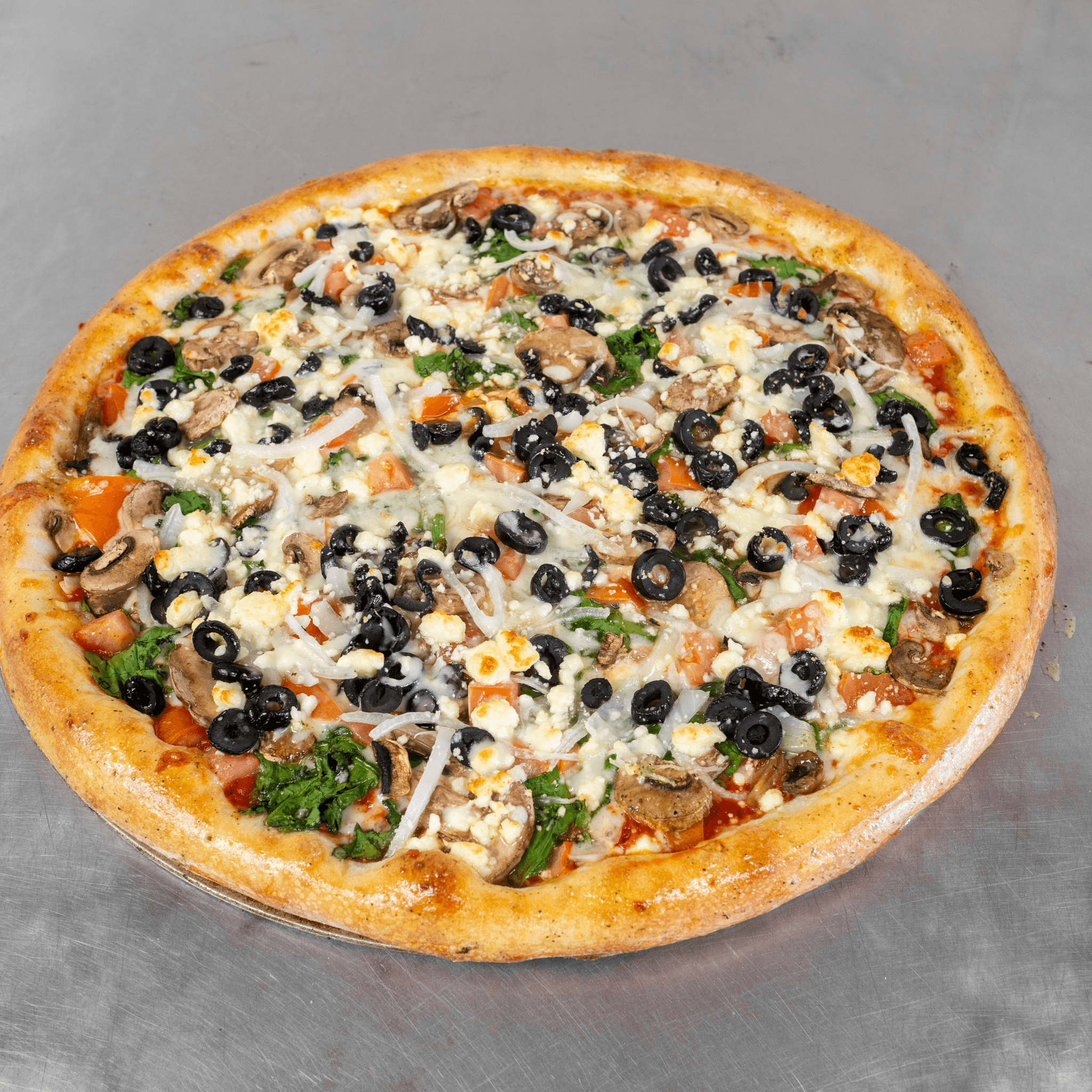 Spinach, onions, mushrooms, tomato, black olives, feta cheese & mozzarella